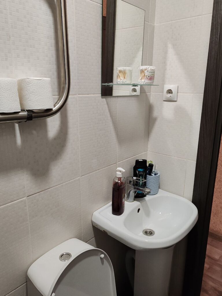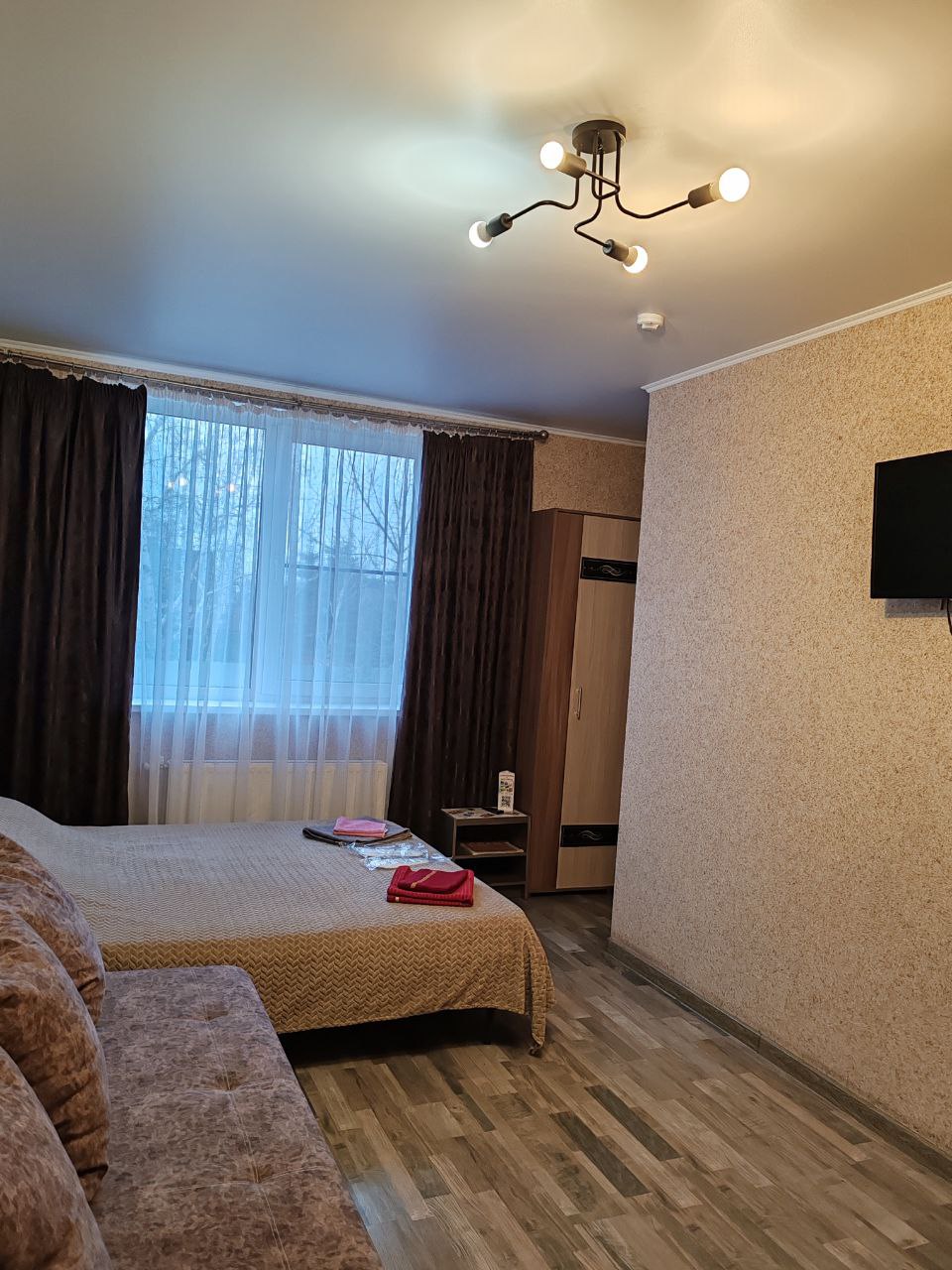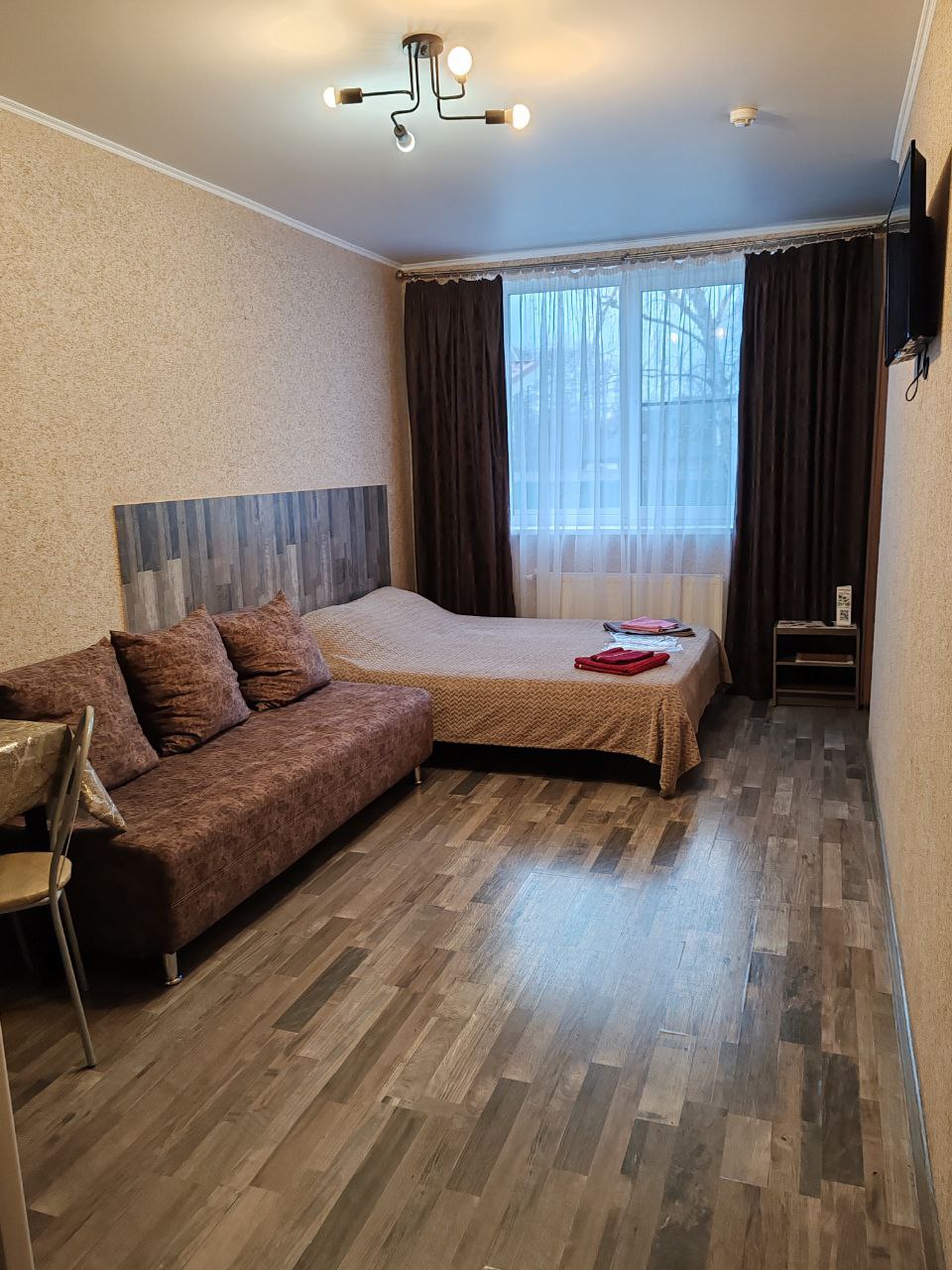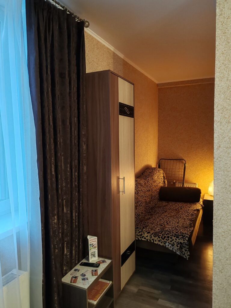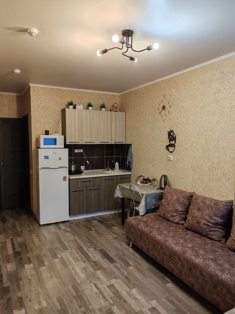 Уютная однокомнатная студия располагается на первом этаже и с комфортом вмещает пять человек (2+2+1). Имеется разнообразная посуда, индукционная плитка, чайник, микроволновая печь, мультиварка, холодильник , утюг, вентилятор в летнее время ,телевизор. Для размещения гостей имеется двухспальная кровать и одноместный диван. Белоснежное постельное белье, полотенца, все моющие средства для душа.